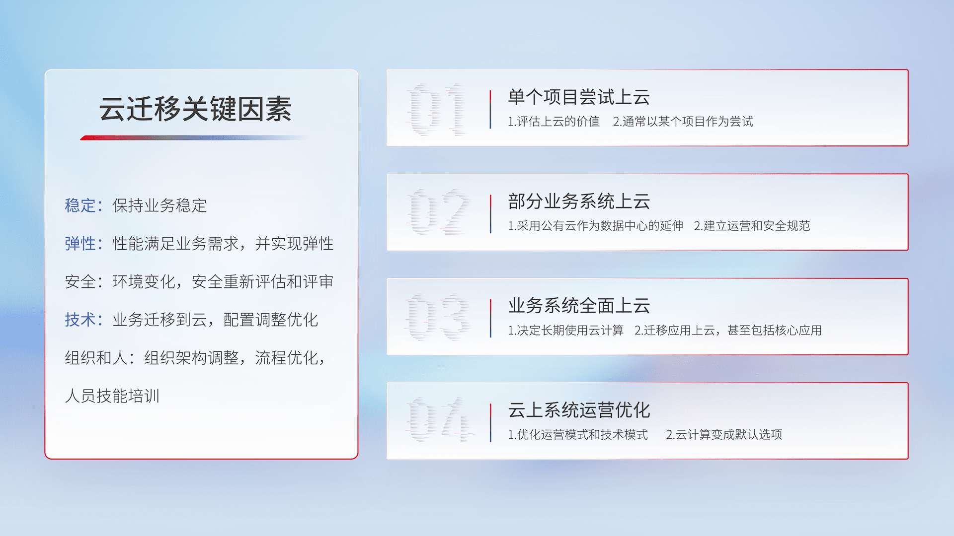 结合实际业务,,从规划设计、、、、云平台选型、、、云原生改造、、、数据迁移、、、集成交付,,,迁移全过程为客户识别最佳上云路径,,做好风险识别管理,,,,设计网络架构、、身份权限、、安全审计合规、、操作审计、、、日志审计、、、监控告警策略、、多站点容灾设计等,,,,对云上基础设施进行整体规划,,,提升IT治理水平,,,以满足弹性、、高可用、、、高性能的需求。。