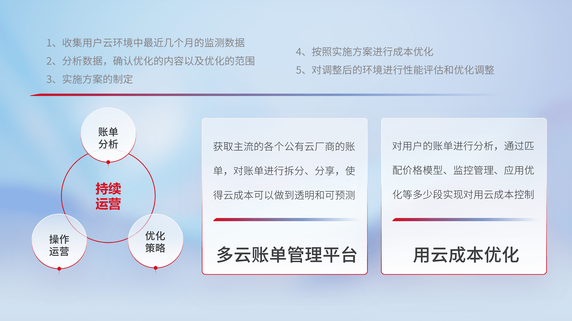 通过多云纳管,,,以统一的资源数据模型把客户的云资源进行抽象和封装,,,进而实现对多云资源的统一操作,,,保障云资源管理的可靠性、、、、稳定性与可用性。。量身定制化运维内容,,配置、、开发运维、、、补丁管理、、、备份、、、、监控、、认证和访问管理、、审计和日常巡检等,,,保障在用云过程中的可靠度,,,稳定度以及高可用率。。