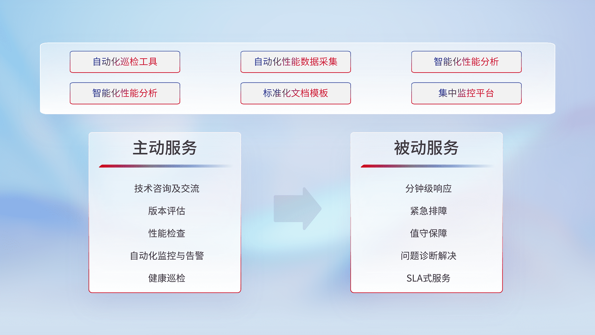 智能化工具和标准化文档,,,,保障服务质量,,,,提供主动服务(包含技术咨询、、、、版本评估、、性能检查、、、、自动化监控与告警、、健康巡检)和被动服务包含(分钟级响应、、紧急排障、、、、值守保障、、、、问题诊断解决、、、SLA服务)。。